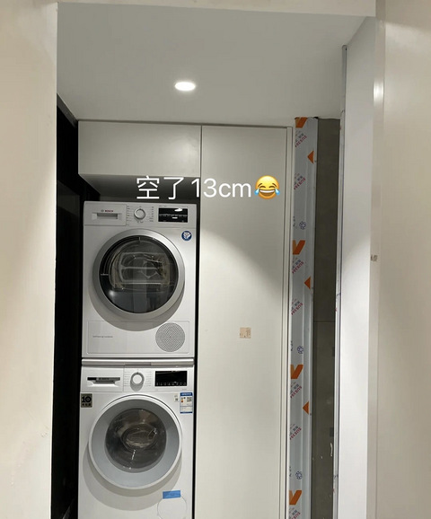 在全屋定制之前去问卖家要了洗衣机和烘干机的尺寸,当初算的是刚刚好留个3~5cm的间隙。结果现在柜子安好了之后,自己专门去量了个高度,发现间隙可能要有个十几厘米。师傅说到时候买个垫洗衣机的架子在下面就行了,没问题的。可是是十几厘米,不是几厘米。在考虑要不要退掉洗衣机、烘干机了,就怕装上就变成这个图的样子