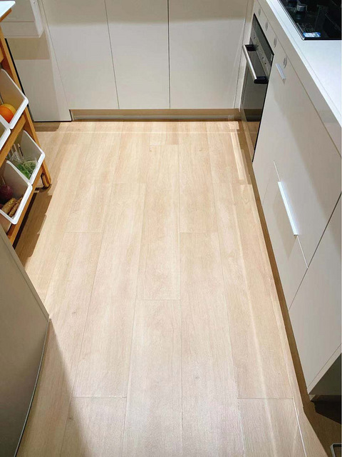真的挑了很多店才买到!铺砖师傅说,虽然我买的不是牌子货,可是质量真不错,比较平整(长尺寸砖很容易不平),硬度也很好,直边的。砖的纹路个人觉得非常逼真,发朋友圈的时候,很多人问我,怎么在厨房铺木地板。]因为要考虑清洁问题,排除了很多砖,这款砖也是ok的,纹路不会凹陷太深。最后就是美缝真的很重要!哑光美缝剂同色调准没错!我用的是众力高的哑光美缝,自己做的,打了送的蜡,施工很方便 用了369铺贴,因为是