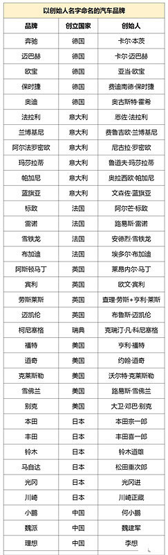 那些用自己姓名来命名的汽车品牌,汽车品牌的名称都喜欢用创始人的姓名来起名,奔驰、保时捷、法拉利、奥迪、玛莎拉蒂等等都是用创始人的姓名来命名的,国内也有几个品牌也是这样,不过感觉是不是听起来差点意思。
