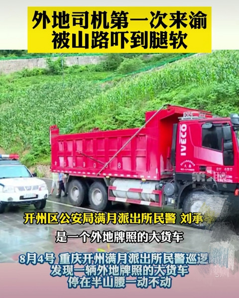 8月4日,重庆开州满月派出所民警在巡逻时,发现一辆外地牌照的大货车,趴在半山腰一动不动,上前询问得知,原来#外地司机首次来渝被山路吓到腿软#,直接把车停在半山腰上,不敢开了。山路:我委屈!