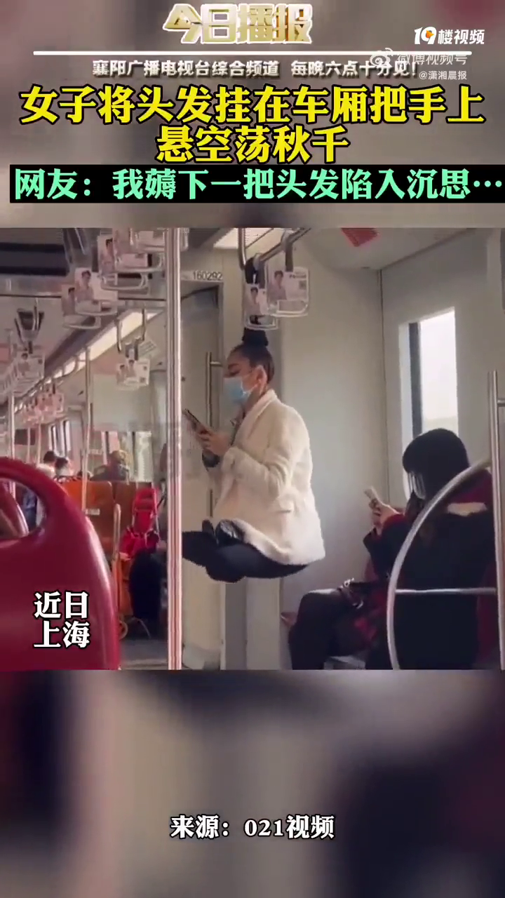 上海,女孩将头发挂在车厢把手上整个人悬空荡秋千的视频引发关注。网友评论道:“《关于我坐地铁遇到了阿拉丁灯神这件事》” ,“我薅下了一把头发陷入了沉思”,“ 我头皮的毛孔都在发抖”……
