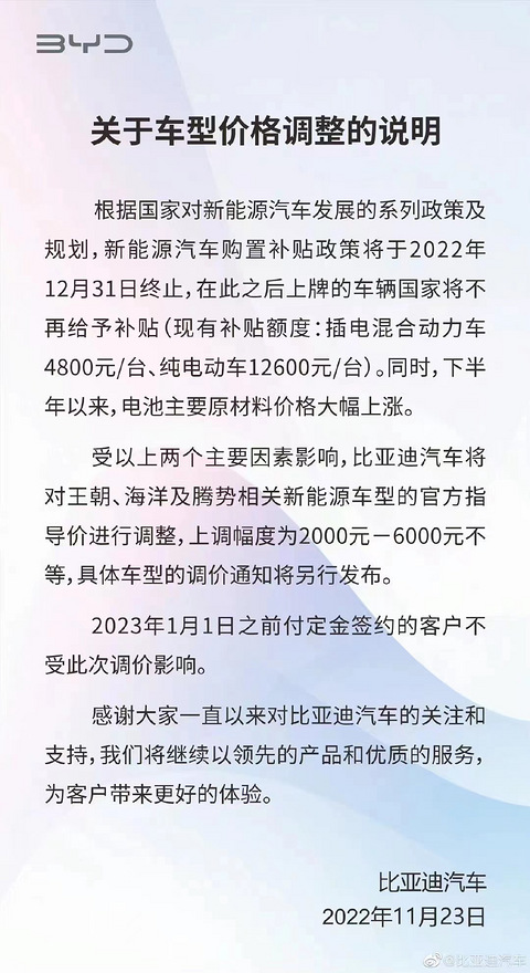 距离新能源汽车补贴完全退坡还有月余之际,比亚迪宣布自2023年1月1日起上调旗下车型官方指导价。11月23日,比亚迪汽车通过官方微博发布《车型价格调整的说明》,其将对王朝、海洋及腾势相关新能源车型的官方指导价进行调整,上调幅度为2000元~6000元不等,具体车型的调价通知将另行发布。 对于此轮涨价原因,比亚迪汽车解释称,根据国家对新能源汽车发展的系列政策及规划,新能源汽车购置补贴政策将于2022