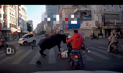 广西一水牛发狂撞倒女子街头乱窜,警方围堵击毙。