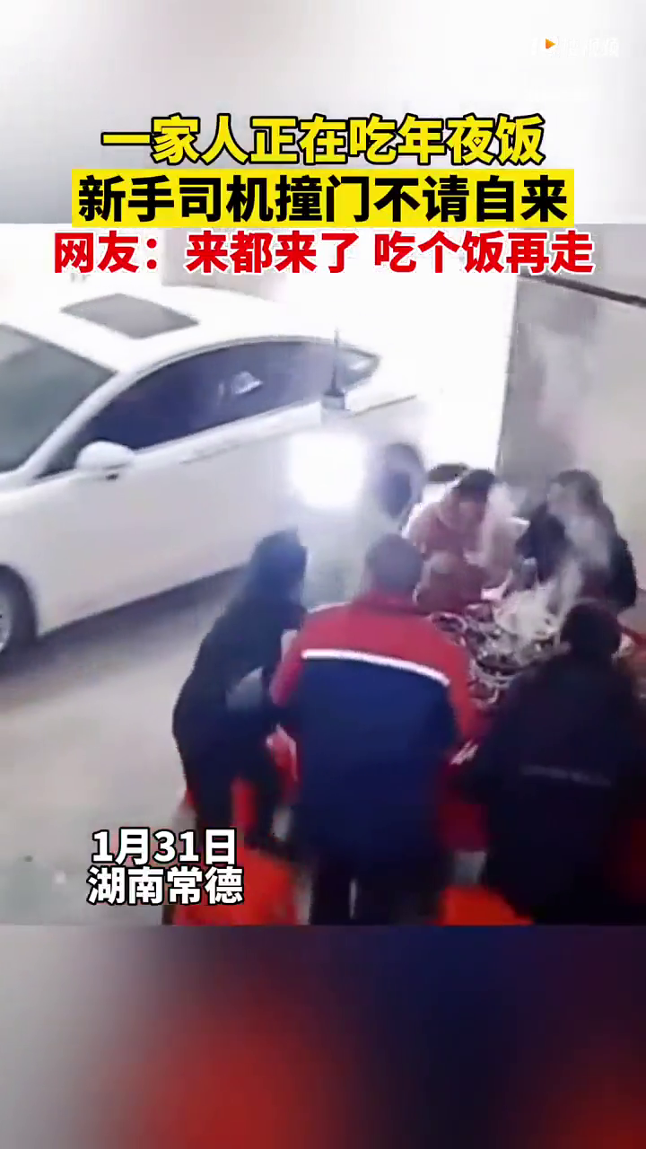 1月31日,湖南常德,新手司机撞门误闯别人家年夜饭。