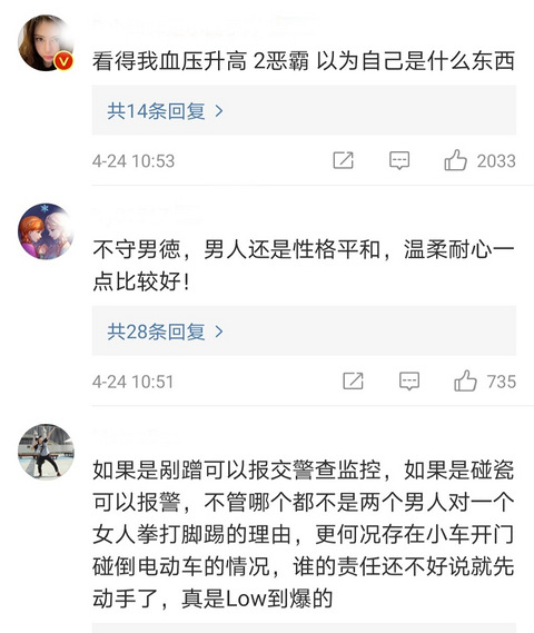 知情居民说奔驰车突然开门碰倒了电动车,这种情况是汽车里的人没有起到注意的义务,应该是汽车的责任。不管谁剐蹭了谁,奔驰车上这俩男的丢人丢到姥姥家了,可算显出你的阳刚之气了,抓头发、抓脸、掌掴,二打一,还是俩男的打一女的,你哥俩真特么爷们儿!