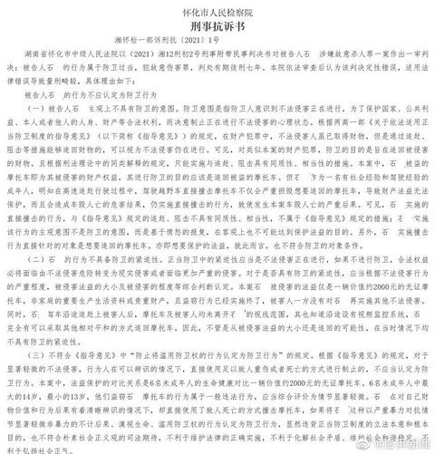 男子石某在被6名未成年人盗走摩托车后,驾驶越野车高速追赶时撞上了摩托车,造成其中一名未成年人当场死亡。事发后,湖南省怀化市中院一审判决石某的行为属于防卫过当,犯故意伤害罪,判处其有期徒刑7年。怀化市检察院则认为石某的行为符合故意杀人罪的构成要件,因此提出抗诉。