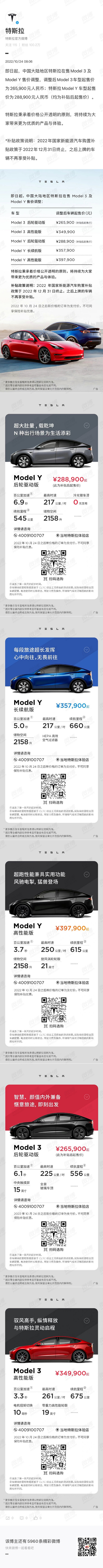 即日起,中国大陆地区特斯拉在售Model 3 及Model Y 售价调整,调整后Model 3车型起售价为265,900元人民币;特斯拉Model Y 车型起售价为288,900元人民币(均为补贴后起售价)。 特斯拉秉承着价格公开透明的原则,将持续为大家带来更为优质的产品与体验。 *补贴政策说明:2022年国家新能源汽车购置补贴政策于2022年12月31日终止,之后上牌的车辆不再享受补贴。