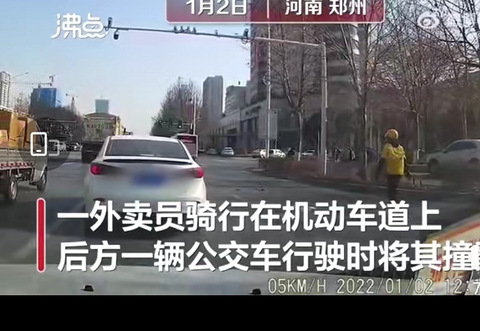 1月2日,河南郑州,一外卖员骑行在机动车道上,后方一辆公交车行驶时将其撞翻后直接开走。外卖员随后报警,交警、公交公司介入调查。3日,郑州市公交公司回应,该公交司机驾车时因视野盲区未发现事故,