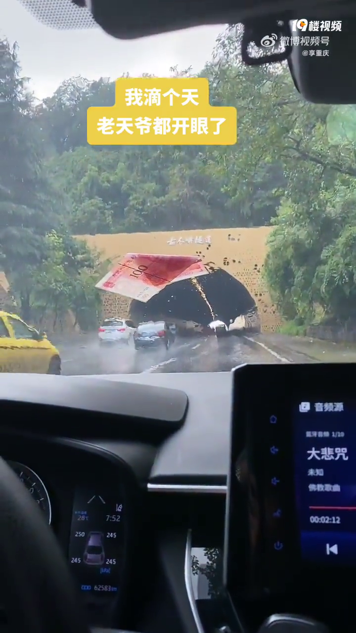 重庆一位网友开车行驶在路上,结果车窗上吹来一张百元纸钞
