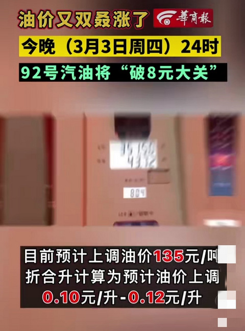 92号汽油今晚或将进入8元时代,下班之后快去加油啦。