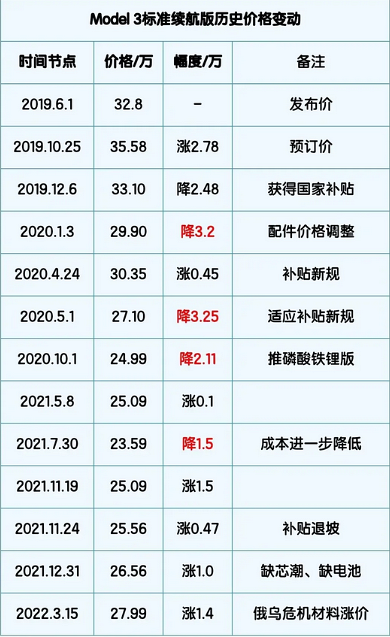 听小道消息特斯拉model3低配又要开始降价。听说要在22年底前调到20多万。可能是21.99W,如果真是这样,那又要掀起国内新能源市场的血雨腥风了,特斯拉的营销套路是先塑造高端形象,然后降价,靠着降维打击对国产形成压制,当特斯拉在国内形成规模后就开始涨价了,单车利润达6万,我们的比亚迪单车利润才4000,怎么选择大家知道了吧! Model 3历史价格