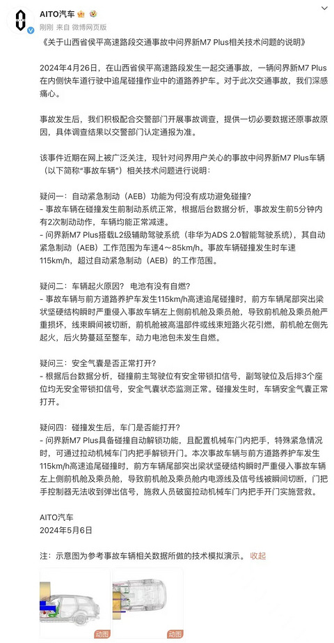 5月6日,AITO汽车 发布《关于山西省侯平高速路段交通事故中问界新M7 Plus相关技术问题的说明》。 https://mp.weixin.qq.com/s/B-JLGVJSsD8DjKls7MIjNQ 其实就算发布了事故说明,这种东西黑子们也是不会去看的,人家只想你死,吃了几碗粉不重要。 而大多数路人只会跟着节奏走,没有分辨事实的能力,也没有独立思考的能力,侧面也证明了为什么xxx始终是少数。