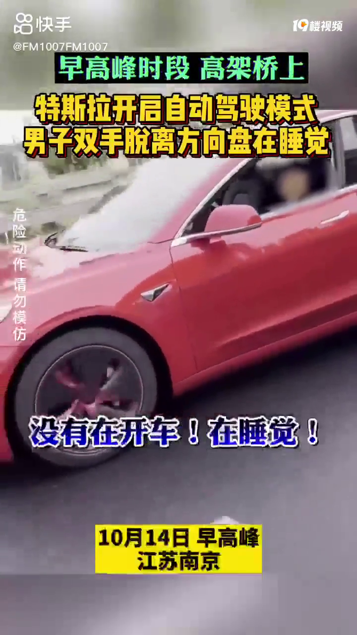 南京一特斯拉司机开自动驾驶脱把闭目休息。