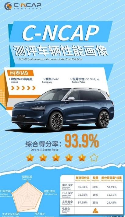 C-NCAP公布问界M9碰撞成绩:刷新最高纪录、首款五星半车型
