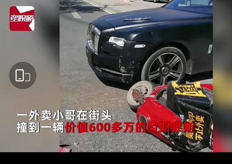 7月15日,广东湛江。一外卖小哥在街头撞到一辆价值600多万的劳斯莱斯。据了解,该车属于当地一车行。由于当时劳斯莱斯是直行,外卖小哥冲上来撞到,此次事故属外卖小哥全责。外卖小哥左腿轻伤,所幸没大问题。车行工作人员称:维修大概需要三四十万! 后续:#外卖员回应撞上劳斯莱斯#【#撞劳斯莱斯外卖小哥称自己是正常直行#目前还未完成判责 事发路口无信号灯】7月15日,广东湛江,#外卖小哥撞上劳斯莱斯维修费3