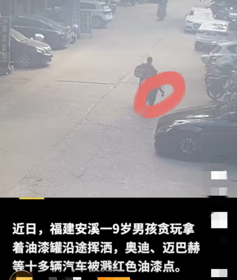 福建安溪一名9岁男孩拿着油漆罐沿途挥洒,奥迪、迈巴赫等十多辆小轿车被溅满红色油漆点。警方表示,经协商,考虑孩子年龄小且家庭经济条件不好,车主们不要求赔偿,目前已对孩子进行批评教育。