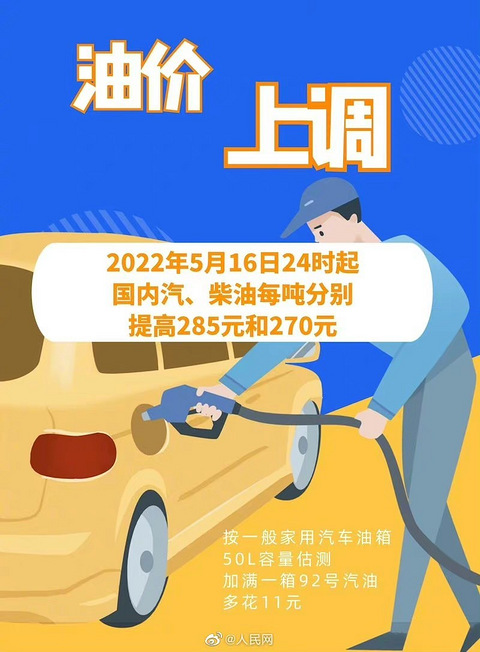 新一轮成品油调价窗口将于5月16日24时开启:国内汽、柴油价格每吨分别提高285元和270元。全国平均来看:92号汽油每升上调0.22元;95号汽油每升上调0.24元;0号柴油每升上调0.23元。按一般家用汽车油箱50L容量估测,加满一箱92号汽油,将多花11元。