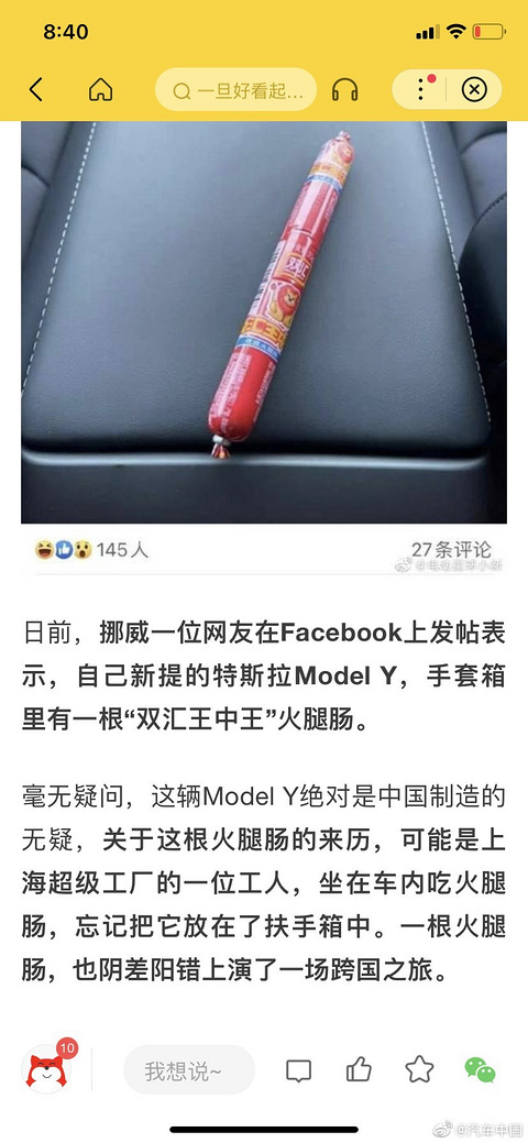 车主发自己新提特斯拉Model Y手套箱里,放双汇火腿肠什么意思