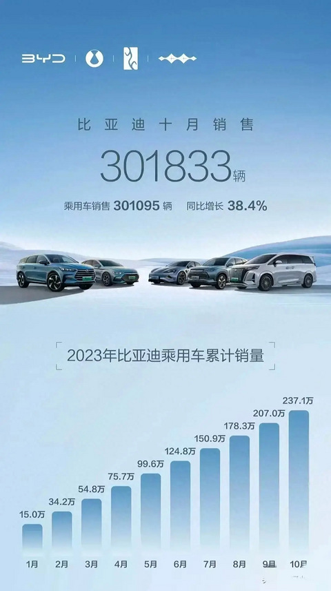 大家还在讨论理想和华为问界的时候,比亚迪已经悄悄霸榜,10月销量突破30万台,同比增长38.4%,其他品牌还在为一个月销量几万得意洋洋的时候,诸不知比亚迪已经遥遥领先。 车讯YYDS