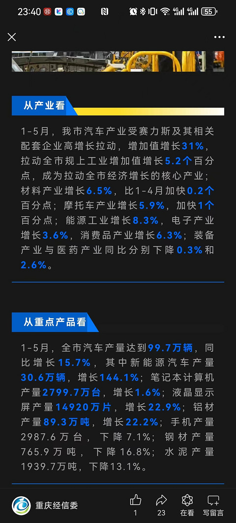 1-5月,全市汽车产量同比增长15.7%,其中新能源汽车增长144.1%,受赛力斯及其相关配套企业高增长拉动,全市规上工业增加值增长5.2个百分点,汽车产业成为拉动全市经济增长的核心产业。 原文:https://mp.weixin.qq.com/s/SCak-nbQv9IfyxkRZt18tQ