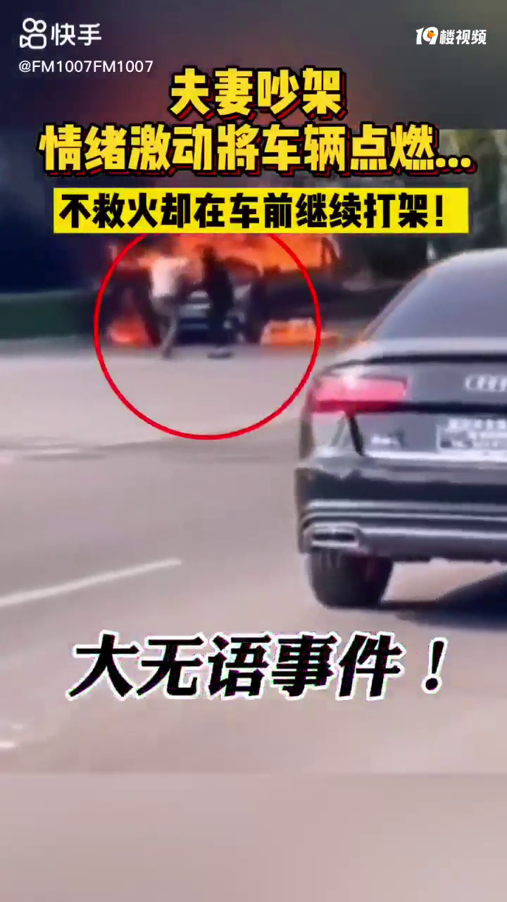 近日,在山西临汾,一对夫妻在马路上争吵,一旁的轿车正在熊熊大火中燃烧,夫妻俩不仅没有救火,反倒愈演愈烈拳脚相加。 从视频中可以看到,一辆黑色商务车在大火中燃烧,车上冒出的黑烟都有两米高,车顶已经被完全烧掉,就在轿车不远处,一对夫妻正在上演激烈的争斗戏码。 黑衣女子和白衣男子在不断拉扯,女子一边拉着男子的胳膊,一边指着烧焦的轿车,神情看上去十分着急,却没有救火的意思。只见男子挣脱出胳膊,一个右勾拳朝