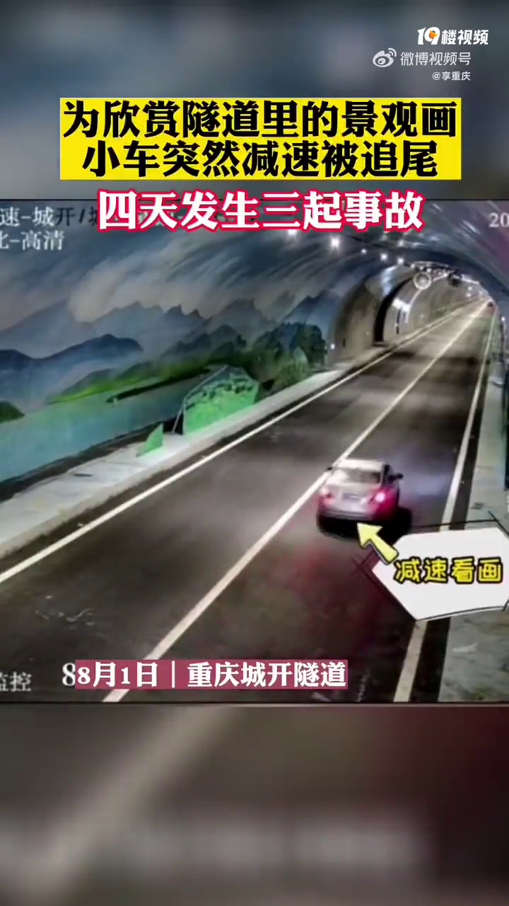重庆城开隧道因4D景观登上热搜,但也因此引发了一系列事故。一辆小车为欣赏隧道里的景观画突然减速,结果被追尾。据悉,该隧道四天内已经发生三起事故。