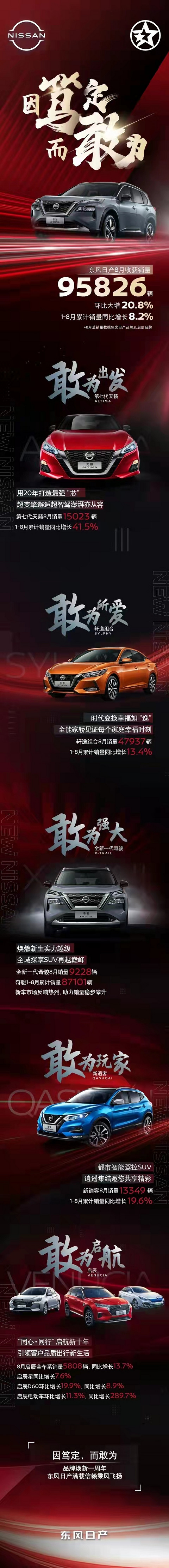 东风日产公布8月销量数据:8月共售出新车95826辆(包含启辰品牌),环比增长20.8%。其中第七代天籁月销15023辆,轩逸家族月销47937辆,全新一代奇骏月销9228辆,逍客月销13349辆,启辰全系月销5808辆,同比增长13.7%。