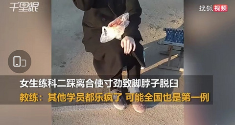 1月18日,山东潍坊。21岁大学女生练科二踩离合时使寸劲导致脚脖子错位,驾校教练刚开始没注意,之后发现女生没办法走路,就赶紧开车送其去医院,拍片子才发现是脚脖子错位脱臼了。驾校教练卢先生称,女生是暑假开始练的,寒假回来刚练了2、3天就扭了,现场其他学员都乐疯了,可能这种情况全国也是第一例