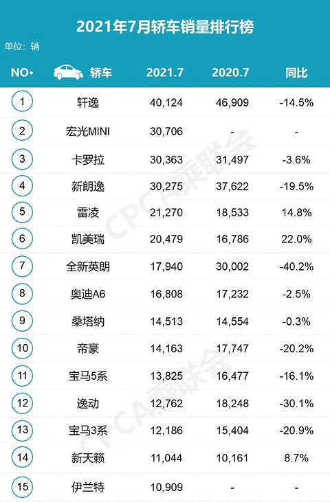 7月轿车销量前15名排行榜出炉,月销超4万的轩逸当之无愧第一