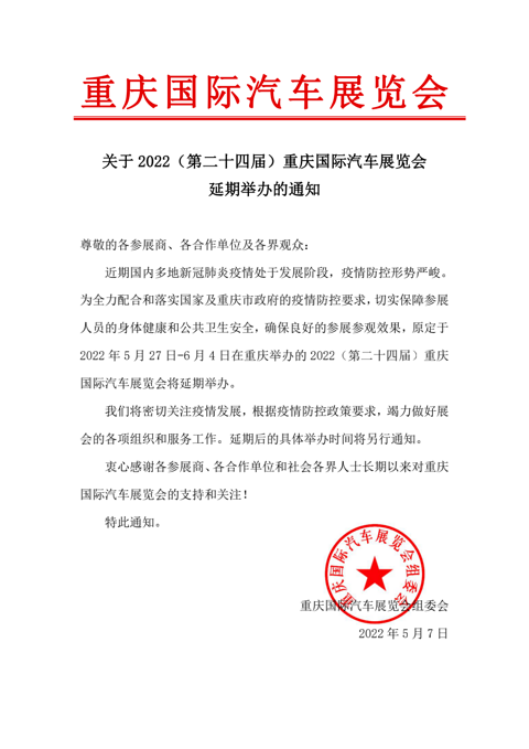 关于2022(第二十四届)重庆国际汽车展览会延期举办的通知