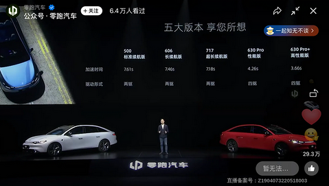 零跑 C01 共 5 个版本。 两驱单电机版: - 500 标续版,百公里加速 7.61s。 - 606 长续航版,百公里加速 7.46s。 - 717 超长续航版,百公里加速 7.18s。 四驱双电机版: - 630 Pro 性能版,百公里加速 4.26s。 - 630 Pro + 高性能版,百公里加速 3.66s。