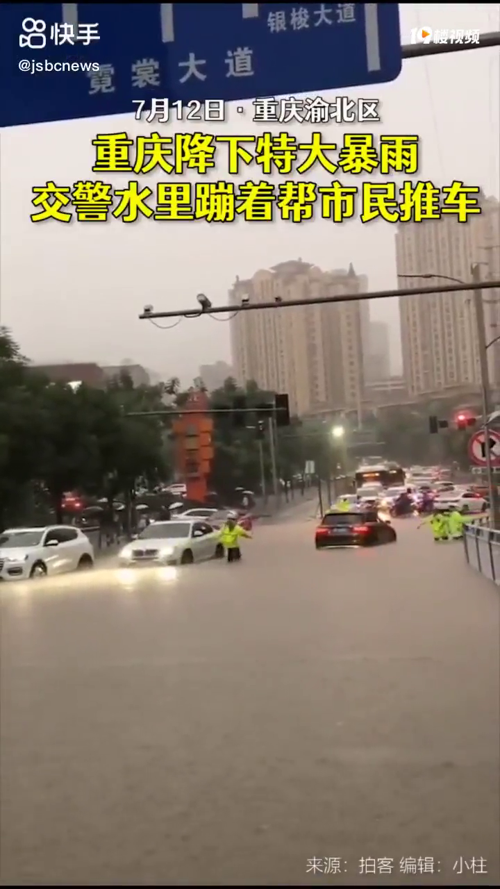 7月12日,重庆降下特大暴雨。重庆渝北区霓裳大道一处低洼处积水过膝,不少车辆被困,几名交警涉水帮推车,其中一名交警从水里蹦着去帮助市民推车,敬业又可爱…