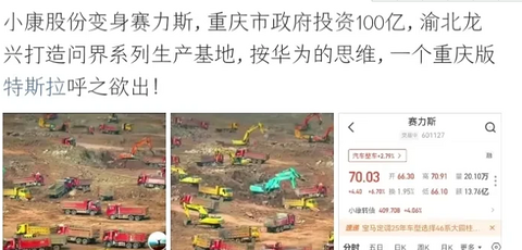 重庆小康股东自从变为赛力斯身份一下子提升了,车子都按百万豪车打造,现在又在重庆两江新区拿地,又得到了政府融资,股价也一下子飙升了,未来可期