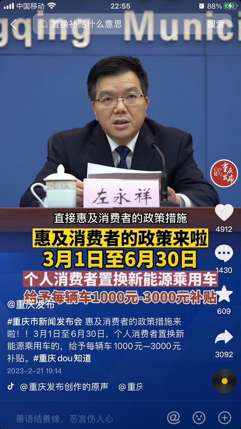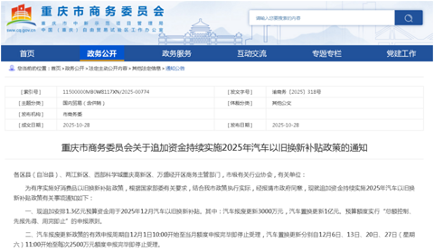 10月28日,重庆市商务委发布最新消息:重庆市12月新增1.3亿元汽车置换更新专项补贴。