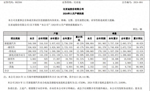 比亚迪公布2024年11月产销快报,11月新能源汽车销量为50.68万辆,去年同期为30.19万辆。