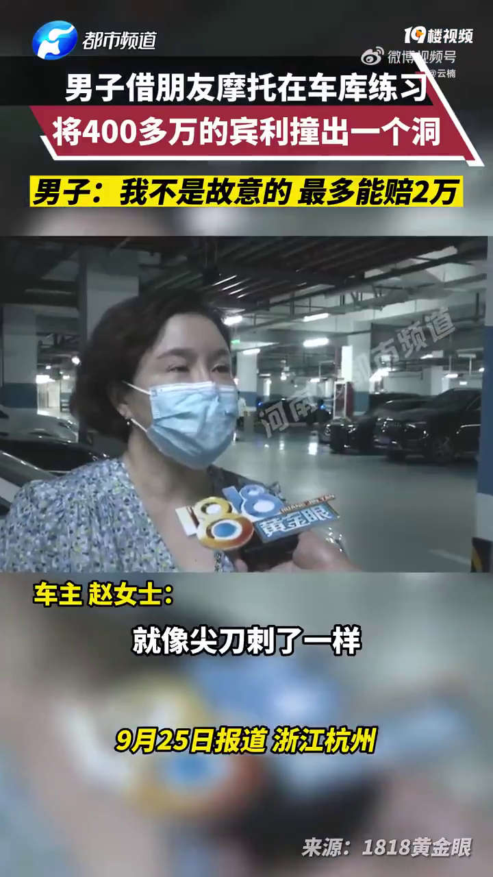 北京的赵女士接到杭州滨江交警打来的电话,说她的宾利跑车被撞了。这辆宾利买来花了400多万,只买了交强险,开了不到两千公里。车子是停在地下车库里,当时有人在车库里练摩托车。