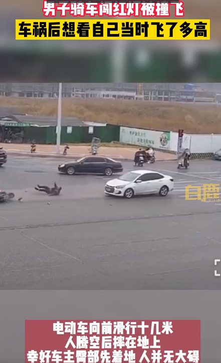 3月16日,安徽阜阳。男子骑电动车过马路时闯红灯,被一辆轿车撞到人车分离,电动车向前滑行十几米,人腾空后摔在地上。万幸的是车主臀部先着地,人并无大碍。事后,这名男子私信交警称,想请交警调取路口监控,看看他事发时“飞了多高”。同时,该男子也表示他这是现身说法,提醒大家注意交通安全。
