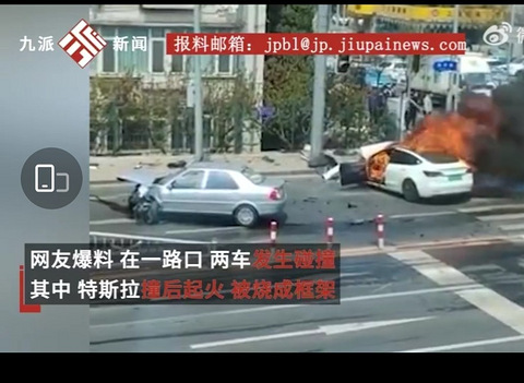 大连一特斯拉与轿车相撞后起火,路人合力救下车内被困人员。
