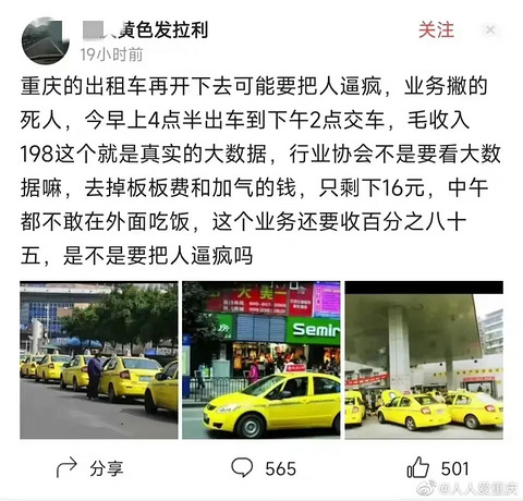 网友投稿:有个出租车师傅吐槽,一天时间毛收收入才198,除去板板费和气费,只剩下16块,中午都不敢外面吃饭。这,你怎么看??