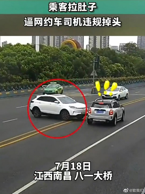 江西南昌,乘客拉肚子,网约车司机在大桥上违规掉头。司机委屈地表示:“没办法,他在那里跟我凶,要逼着我掉头。”最终,该司机被罚款200元记1分。