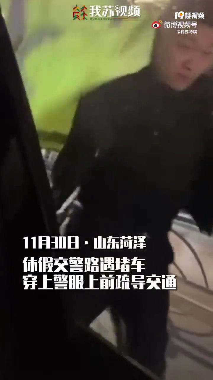 11月30日,山东菏泽,一位交警在休假期间,遇到了交通堵塞。他立即穿上警服,让妻子开车,自己去疏导交通。妻子翟女士表示,看到丈夫义无反顾往前冲的背影,觉得很帅。经交警指挥,仅仅10分钟后,该路段交通恢复正常。
