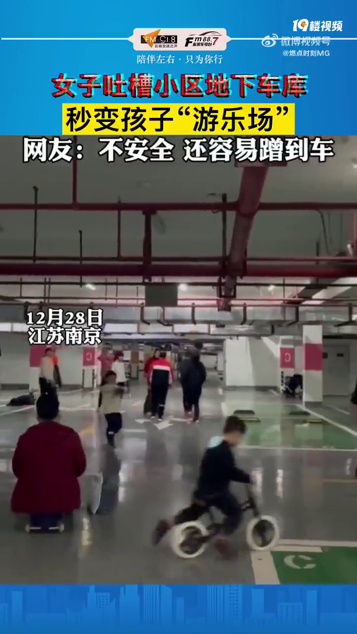 12月28日,有网友拍视频吐槽,南京某小区地下停车场成了游乐场,不少家长和孩子在此嬉戏玩耍。甚至有孩子骑着自行车或平衡车追逐穿梭,没有大人跟着,十分危险。提醒:不要在地下停车场嬉戏打闹。