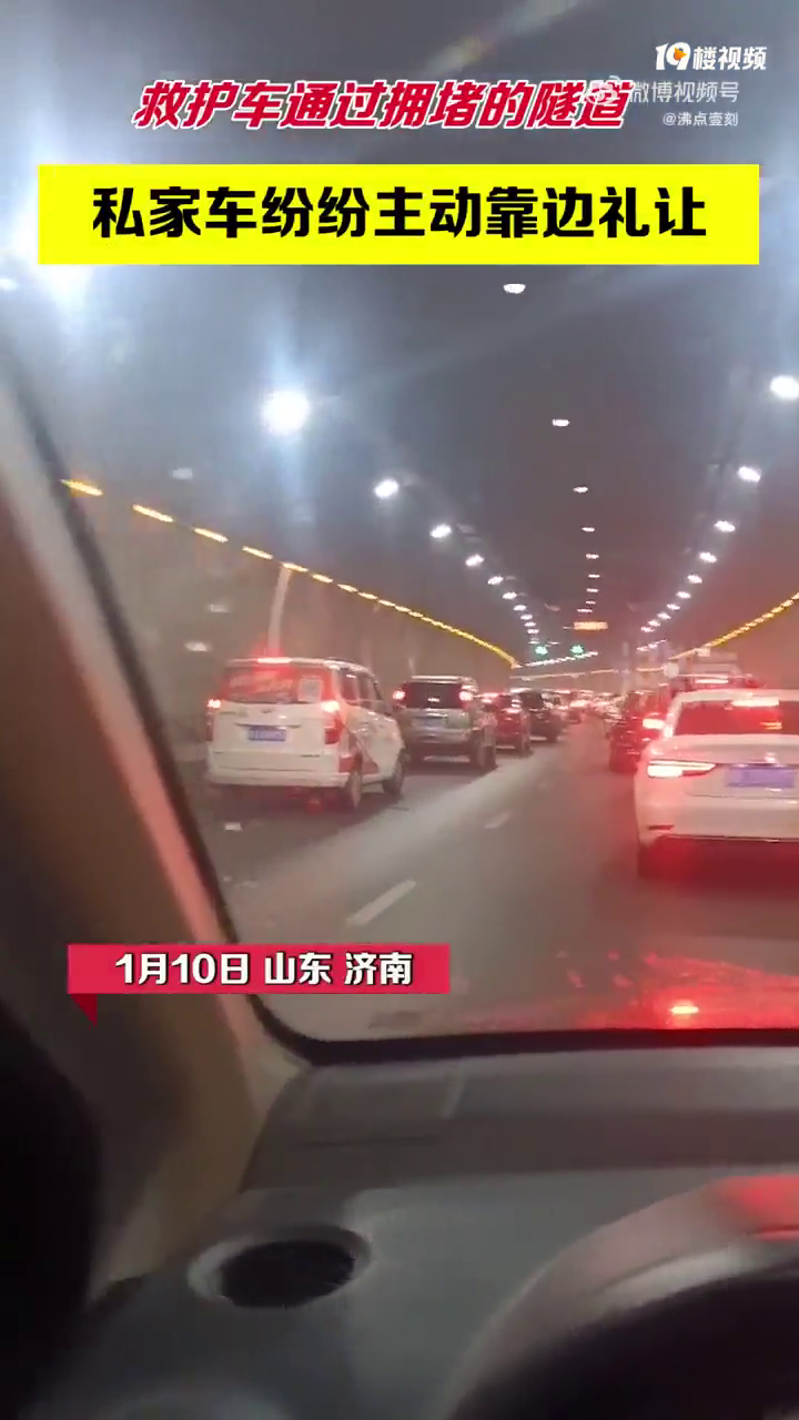 1月10日,山东济南玉函路隧道,堵车的私家车主们纷纷靠边礼让救护车通行。视频拍摄者董先生表示,当时隧道堵车,听见后方的救护车警笛声,100多辆车积极主动的往两边贴,把路给让出来了,自己作为一名司机很感动。网友:为素质点赞!