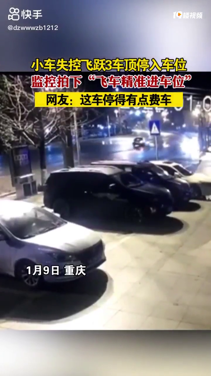 1月9日,重庆,一小车失速冲向路边,随后飞跃过多辆小车,准确落在小车缝隙中,“完美”落地,事故造成多车损坏。