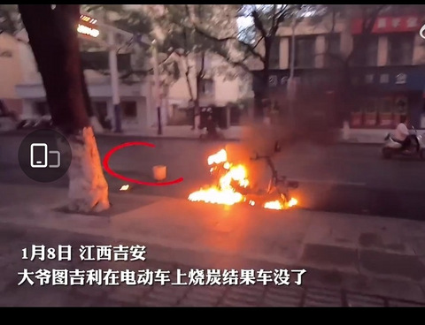 1月8日,江西吉安,一位大爷为图吉利,盛满一桶木炭放在电动车上燃烧,愿新的一年红红火火,不料将电动车引燃。消防员赶到将火扑灭,但电动车被烧成空架。网友:仪式感满满,危险度爆棚! ?