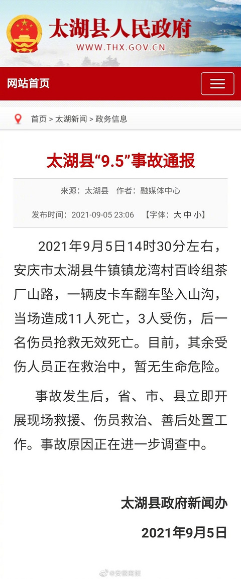 2021年9月5日14时30分左右,太湖县牛镇镇龙湾村百岭组茶厂山路,一辆皮卡车翻车坠入山沟,当场造成11人死亡,3人受伤,后一名伤员抢救无效死亡。目前,其余受伤人员正在救治中,暂无生命危险。事故发生后,省、市、县立即开展现场救援、伤员救治、善后处置工作。事故原因正在进一步调查中。