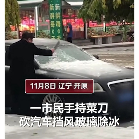 因前一天晚上下了雨夹雪,8日早上气温下降较大,导致很多停在户外汽车的车窗都冻上一层冰。一位男子直接拿着一把菜刀在前挡风玻璃上砍起来,一刀一刀把冰给砍掉。网友:力度拿捏得还挺好。