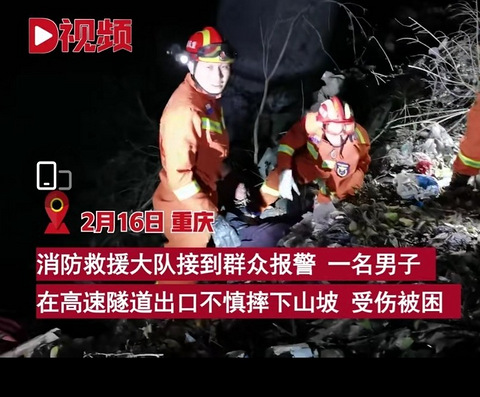 2月16日,重庆。奉节消防救援大队接到群众报警,一名男子在高速隧道出口不慎摔下山坡,受伤被困。消防赶到现场发现,男子掉在护栏下10米处斜坡,由于落在杂草树枝上,无生命危险,但颈部受伤。指挥员决定用担架转移被困群众,为减轻疼痛,消防员一手护着男子颈部,一手抬担架。随后,120到达现场,对被困人员进行检查,颈部固定后,将伤者送医。据悉,该男子想上厕所,但错过服务区,想翻过护栏路边解决,结果天太黑 不慎