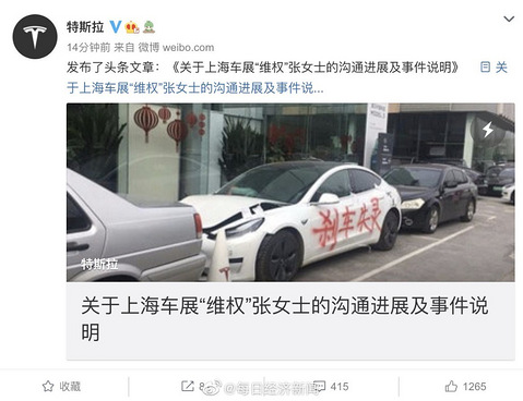 4月28日特斯拉在其官博发布一篇《关于上海车展“维权”张女士的沟通进展及事件说明》,公布了与上海车展张女士沟通进展情况,以及海车展张女士“维权”事件简要经过。特斯拉在说明中表示,4月27日下午2时29分,我们已经与张女士取得联系,表达了进一步沟通的意愿和诚意。张女士表示,“我刚回来。需要调整一下。我希望你们能够拿出真正解决问题的态度。等你们有了这个态度,我们再沟通。”在主动联系张女士但无明确进展的
