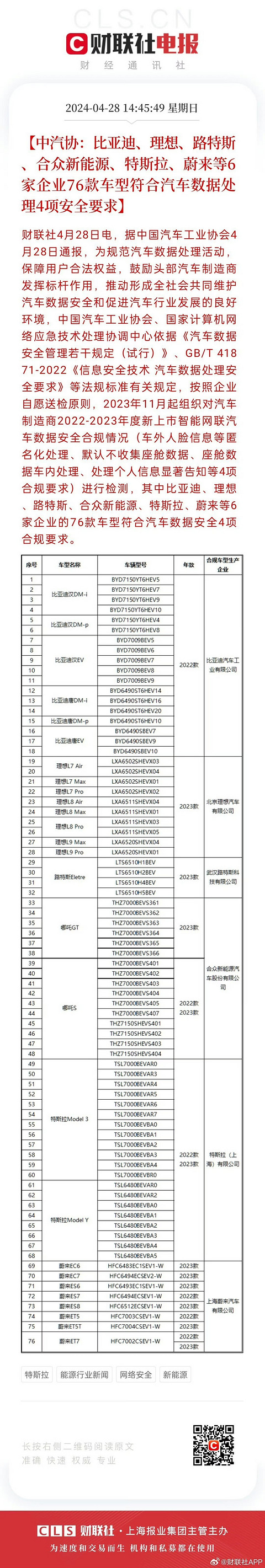 【中汽协:比亚迪、理想、路特斯、合众新能源、特斯拉、蔚来等6家企业76款车型符合汽车数据处理4项安全要求】财联社4月28日电,据中国汽车工业协会4月28日通报,为规范汽车数据处理活动,保障用户合法权益,鼓励头部汽车制造商发挥标杆作用,推动形成全社会共同维护汽车数据安全和促进汽车行业发展的良好环境,中国汽车工业协会、国家计算机网络应急技术处理协调中心依据《汽车数据安全管理若干规定(试行)》、GB/T